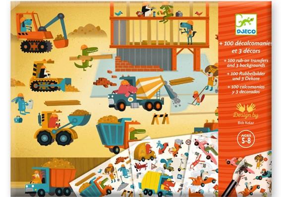 Erilaisia työkoneita ja autoja, jotka siirretään maisemaan värittämällä lyijy- tai kuulakärkikynällä kuvan päälle.