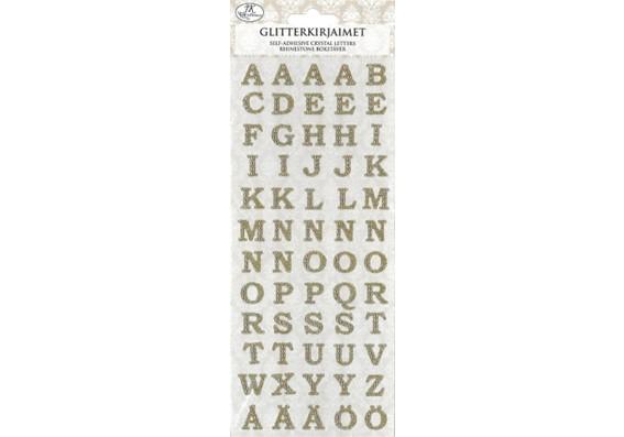 Glitterkirjantarrat askarteluun ja koristeluun. Pakkaus sisältää 60 kappaletta muovisia kirjaintarroja, joissa on glitteriä ja tarrahelmiä.