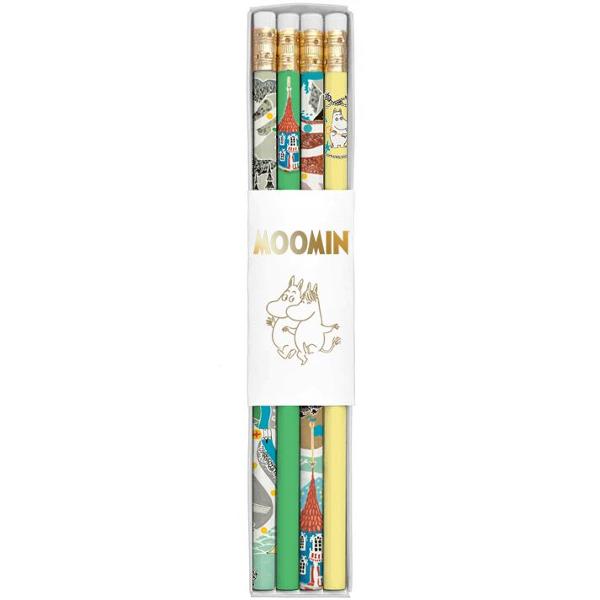Lyijykynäsetti Putinki Muumi, sisältää neljä eriväristä lyijykynää. Kynissä on mattapinta ja kuvia muumipelistä. Kynän päässä valkoinen pyyhekumi. Lyijykynän pituus 190 mm, rasian koko 34 x 198 x 17 mm. © Moomin Characters™.