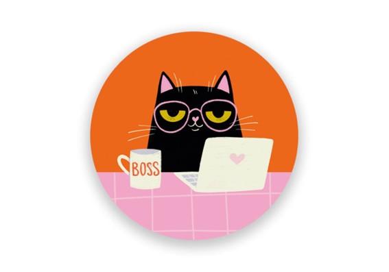 Laadukas sisustusmagneetti jääkaapin oveen tai magneettiseen muistitauluun. Magneetin kuvassa musta Helvi-kissa läppärin äärellä, Boss-kahvikuppi vierellä. Tyylikäs mattapinta. Koko M, 56 mm. Design: Kaisu Sandberg.