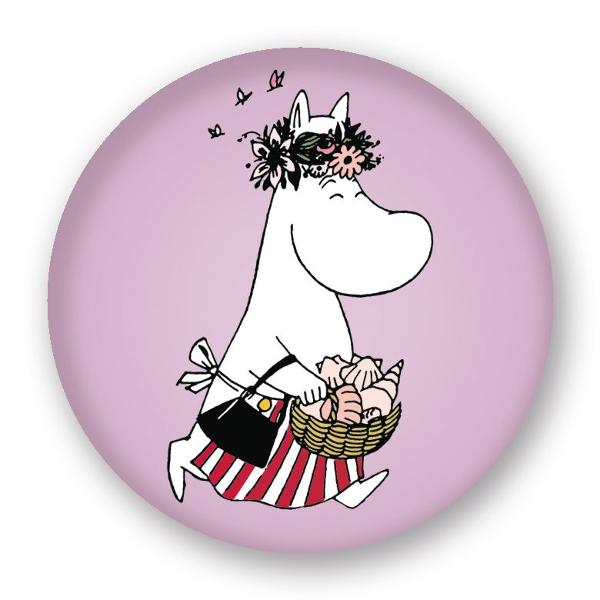 Laadukas mattapintainen sisustusmagneetti jääkapin oveen tai magneettiseen muistitauluun. Magneetin kuvassa Muumimamma ja korissa simpukoita, vaalean lila tausta. Koko M, 56 mm. © Moomin Characters™