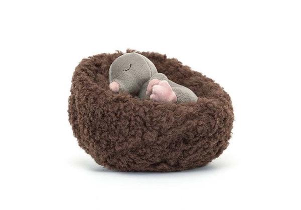 Jellycat suloistakin suloisempi pieni myyrä, jolla on pehmeä turkki ja oma pesä.