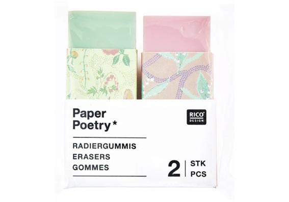 Pyyhekumisetti, jossa on kaksi eri väristä pyyhekumia, vaaleanvihreä ja vaaleanpunainen kukkakuvioilla. Yhden pyyhekumin mitat ovat 10 x 18 x 34 mm. Rico Design, Paper poetry