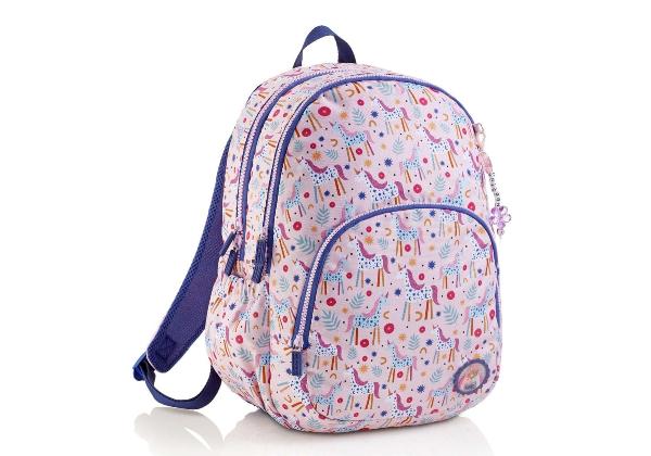 Reppu, jossa on kolme lokeroa: kaksi päälokeroa ja yksi etutasku.