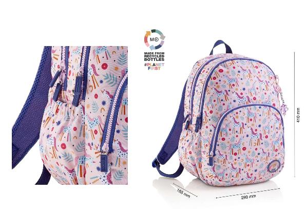 Ulkopinta RPET:iä (kierrätettyä polyesteriä). Sisävuori polyesteriä. Kaksi päälokeroa, joissa tuplavetoketjut. Tilavuus 27 litraa.