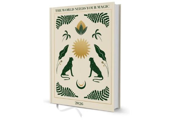 Pieni kovakantinen viikkopäivyri vuodelle 2026 Uhana Designin horoskooppiaiheisilla kuvituksilla. Kannessa kultainen aurinko ja tummanvihreitä graafisia kuvioita luonnonvalkoisella pohjalla. Aukeamalla viikkonäkymä ja tilaa muistiinpanoille, sisäkuvituksia. Sisältää kuukausinäkymän joka kuukaudelle, Koko: 12 x 17 cm, kalenterissa on lukunauha. Kielet: suomi ja ruotsi. Sisältää suomalaiset ja suomenruotsalaiset nimi- ja liputuspäivät, sekä kuun vaiheet. Design: Uhana Design.