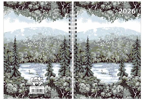 Ihastuttava Vallila design-kalenteri vuodelle 2026. Muonio-kuosin on suunnitellut Riina Kuikka. Tässä kartonkikantisessa parikierresidotussa mallissa on kolmikielinen viikkonäkymä 12 kuukauden sisällöllä. Kielet suomi, ruotsi ja englanti. Suomalaiset nimi- ja juhlapäivät. Sisältää vuosisuunnitelman, liputuspäivät, suomenkieliset nimipäivät, tehtävälistoja ja runsaasti muistiinpanotilaa, sekä viivoilla että ruuduilla. Valmistettu FSC-sertifioidusta paperista.